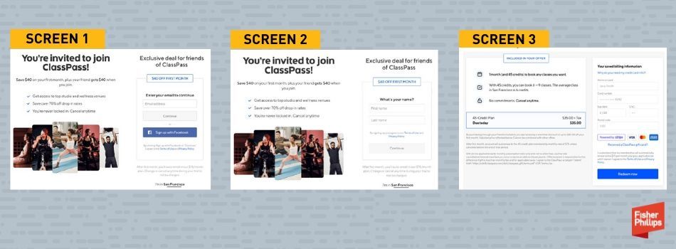 The Court analyzed how visitors interacted with the ClassPass website, focusing on “Screens 1, 2, and 3.” (See below for screenshots; click to expand)