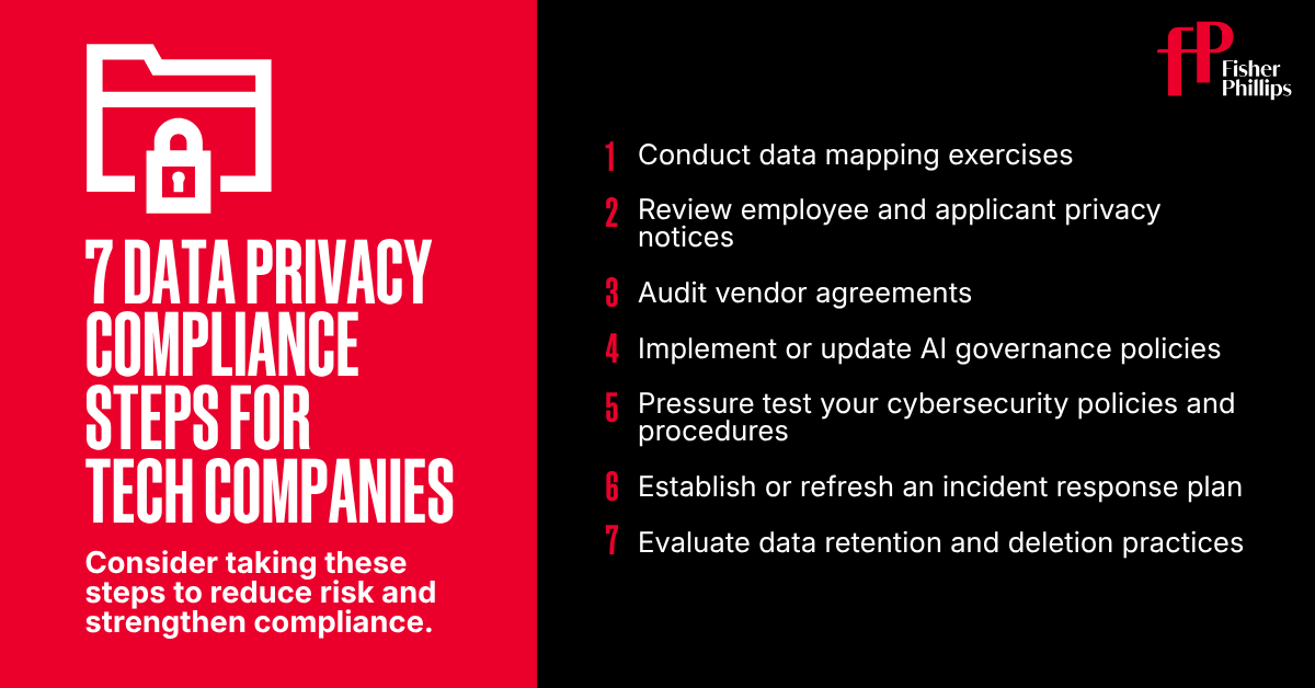 As AI use accelerates, regulators are focusing more on data privacy enforcement – which means businesses need to make compliance a strategic priority. For tech companies in particular, the volume and sensitivity of data flowing through their systems creates heightened exposure under an expanding patchwork of data privacy laws. Whether you are a startup scaling quickly, or an established technology company integrating AI tools into your operations, here are seven things you need to know and seven steps you should consider taking now.