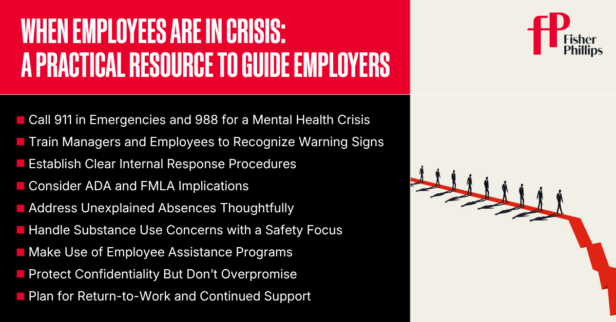 When an employee stops showing up to the office, talks about wanting to give up, or appears impaired during work hours, managers and HR staff might feel unsure how to respond. But you can be supportive while also addressing legal obligations, safety, and business needs through a bit of planning, training, and resources. While employers are generally not mental health professionals, you can play a critical role in identifying warning signs and connecting employees with the support they need. Here are eight practical steps to help your managers and HR department respond in real time to serious and sensitive situations, as well as the key legal points to keep in mind.