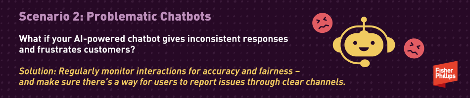 What if your AI-powered chatbot (a probabilistic tool that replaced your deterministic chatbot) gives inconsistent responses and frustrates customers? Solution: Regularly monitor interactions for accuracy and fairness – and make sure there’s a way for users to report issues through clear feedback loops.