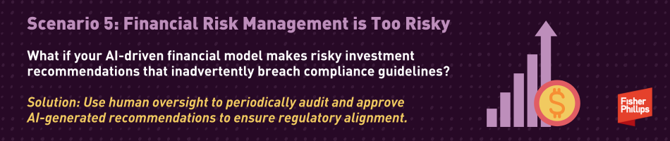 What if your AI-driven financial model makes risky investment recommendations that inadvertently breach compliance guidelines? Solution: Use human oversight to periodically audit and approve AI-generated recommendations to ensure regulatory alignment.