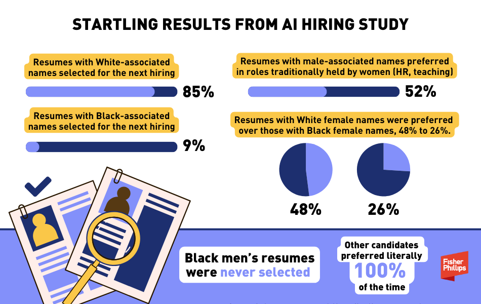 A new study reveals that popular AI-based resume screening tools often favor White and male candidates, showing that resumes tied to White-associated names were preferred 85% of the time. The University of Washington Information School study found that AI resume screening may inadvertently replicate – or even amplify – existing biases against certain demographics, and the implications are clear: without targeted safeguards, AI tools may lead to discriminatory hiring practices, even if inadvertent. This Insight breaks down the study’s findings, explains why they matter for HR professionals, in-house counsel, and employers, and provides five practical steps you can take to avoid AI bias at your workplace.