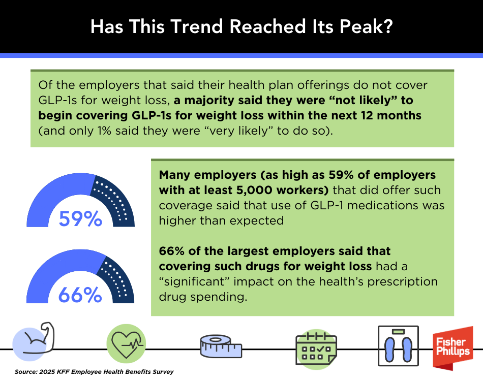 However, the KFF report indicates that this new trend might have reached its peak. Of the employers that said their health plan offerings do not cover GLP-1s for weight loss, a majority said they were “not likely” to begin covering GLP-1s for weight loss within the next 12 months (and only 1% said they were “very likely” to do so).