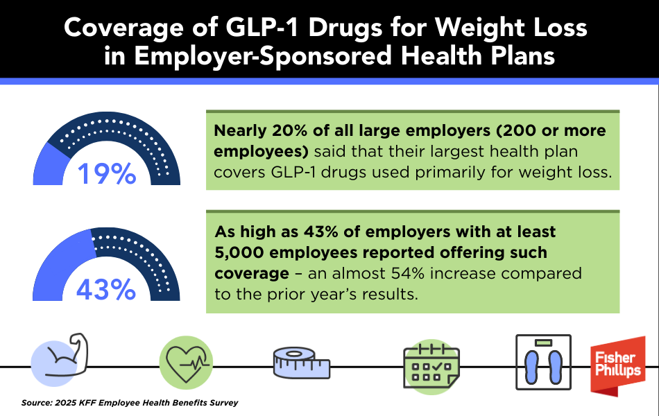 - Nearly 20% of all large employers (200 or more employees) said that their largest health plan covers GLP-1 drugs used primarily for weight loss. This represents little change from survey results in 2024.