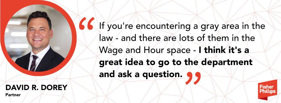 "If you're encountering a gray area in the law – and there are lots of them in the Wage and Hour space – I think it's a great idea to go to the department and ask a question,” he said. “And I think what you're going to see is a really big appetite to tackle those questions, because they provide some level of certainty beyond where things are now about where the department might come out under a certain set of facts.”