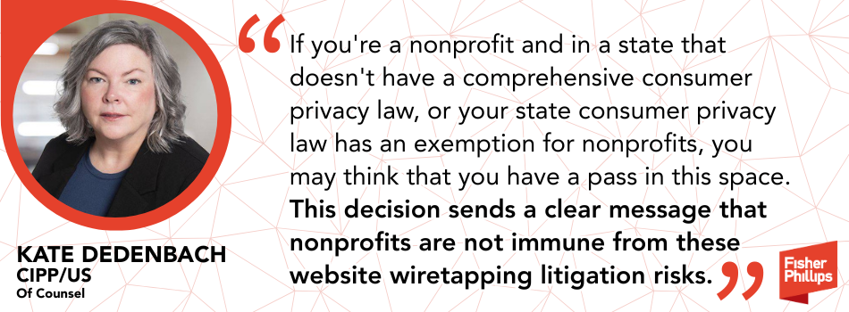 “If you're a nonprofit and in a state that doesn't have a comprehensive consumer privacy law, or your state consumer privacy law has an exemption for nonprofits, you may think that you have a pass in this space,” said Kate Dedenbach, Of Counsel in Fisher Phillips' Detroit office. “This decision sends a clear message that nonprofits are not immune from these website wiretapping litigation risks.”