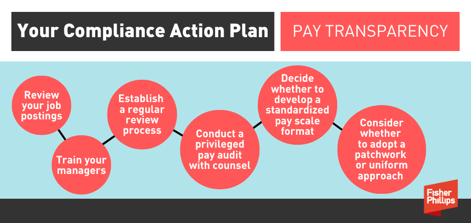Now is a good time to create or update your pay transparency compliance plan. Although your specific plan will depend on which state and local laws apply to your operations, you should generally consider taking the following steps: